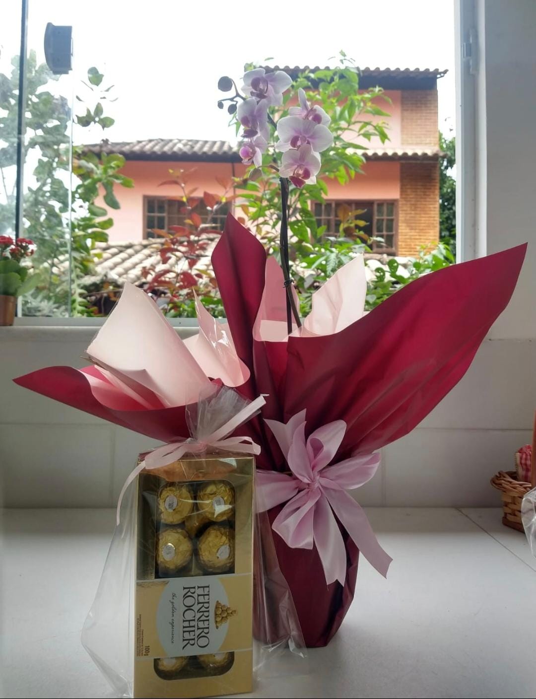 Acompanha uma caixa de Ferrero rocher, o vasinho de flor, uma torta confeitada ou bolo caseiro especial., uma caneca de porcelana.