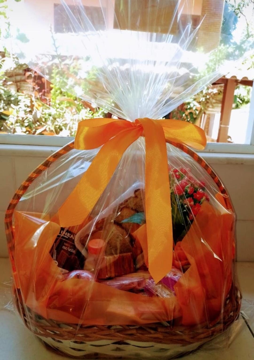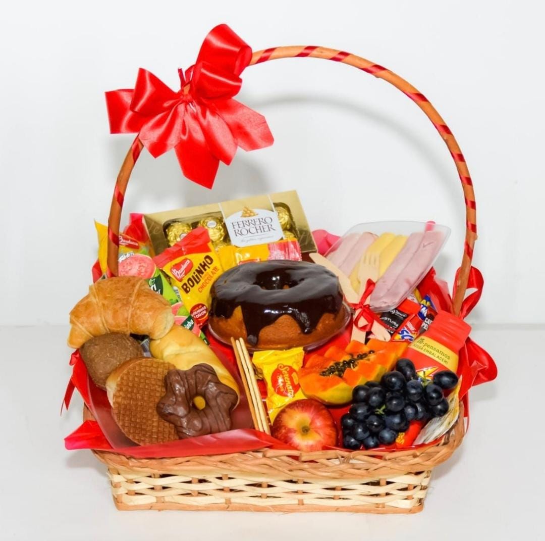 Composta de 4 pães (brioches), três frios ( queijo prato, presunto e peito de peru), três tipos de frutas, iogurte em garrafinha, geleias em pote de.vidro, mel, torradas bauducco, biscoitos stropowafel (receita holandesa com recheio de caramelo) , biscoito amanteigado de Petrópolis, suco de fruta 100% integral, achocolatado, café dripp coffee, chá twinings, capuccino ou chocolate, açúcar, manteiga, requeijão, pão de mel de chocolate belga, biscoito salgado club social, bolinho recheado bauducco, tem mais num suco de fruta em lata, polenguinho, croissant. Acompanha uma caixa de Ferrero rocher, o vasinho de flor, uma torta confeitada ou bolo artesanal de laranja ou cenoura com chocolate e uma caneca ou xícara de porcelana lisa ou de polipropileno decorada.