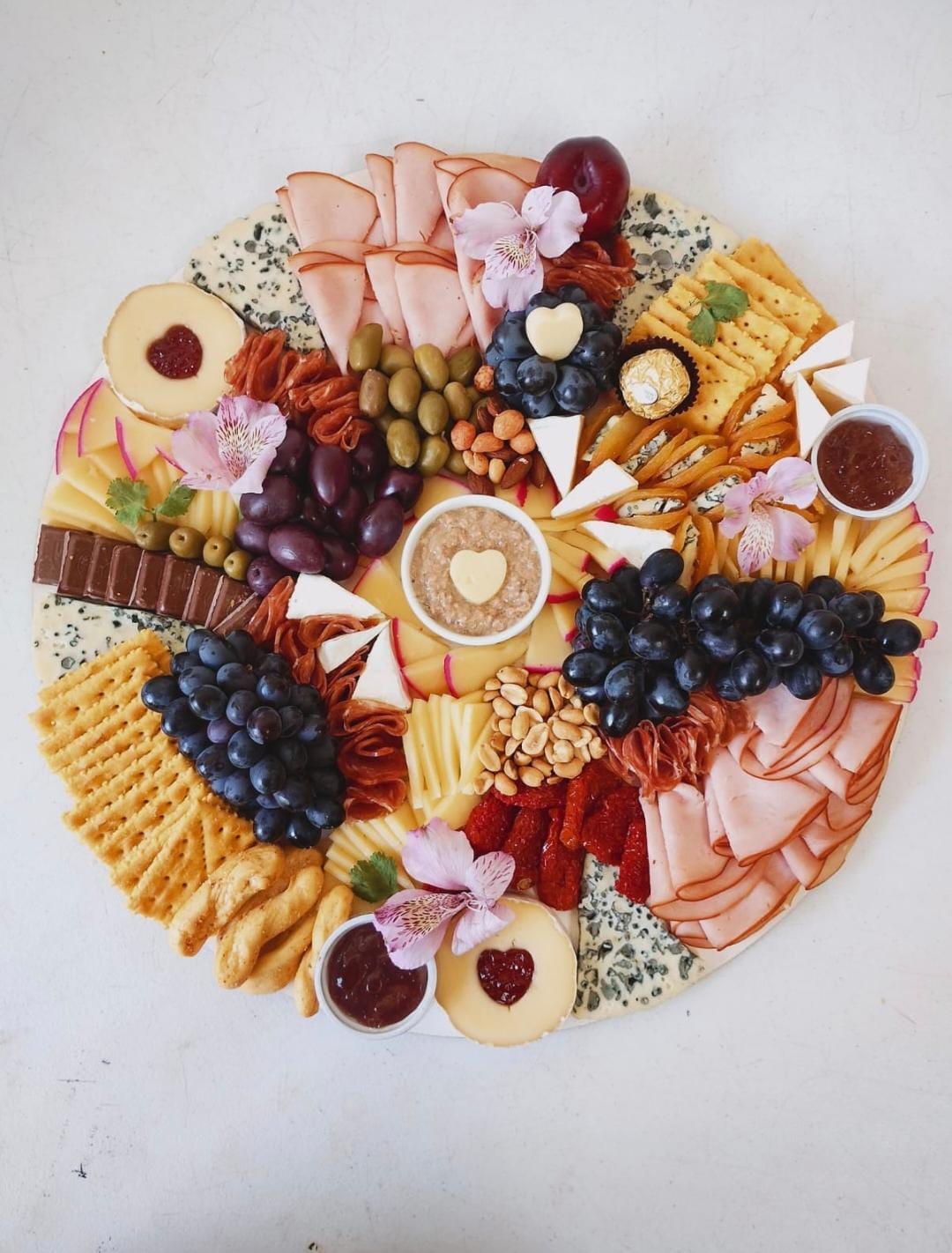 Composta por queijos camembert, brie, bola, parmesão, gorgonzola, presuntos e peito de peru, lombo defumado, salame, ovo de codorna, frutas secas como damasco, castanhas, amendoins, biscoitos snacks, torradinhas, pasta, geleia e frutas. Pra dar o charme final algum chocolate ( snacks de chocolate belga ou lindt ou similar).